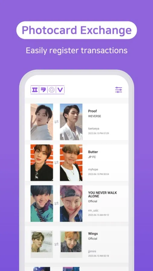 You can find a perfect deal by filtering the photocards you have and the photocards you are looking for.