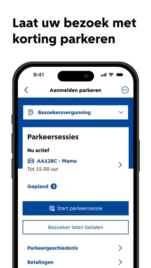 Met de app start en stopt u makkelijk en snel een parkeersessie voor uw bezoek. U voegt eenvoudig saldo toe om de parkeersessie af te rekenen. Of uw bezoek betaalt zelf, via een eigen account.