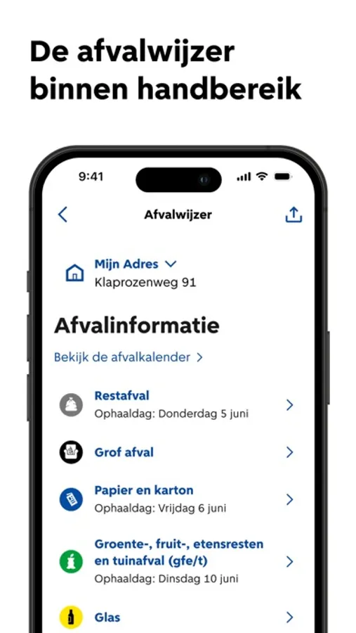 De afvalwijzer geeft aan op welke dagen we afval bij u ophalen. Ook ziet u waar de containers staan voor restafval, glas, papier/karton, textiel, groente-,fruit- en etensresten.