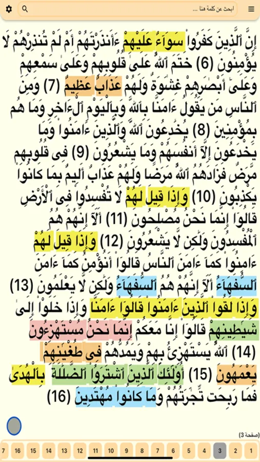 يمكنك من خلال التطبيق تحديد كلمة معينة في الآية و البحث عنها ومعرفة اماكن تكرارها في القرآن كاملاً.