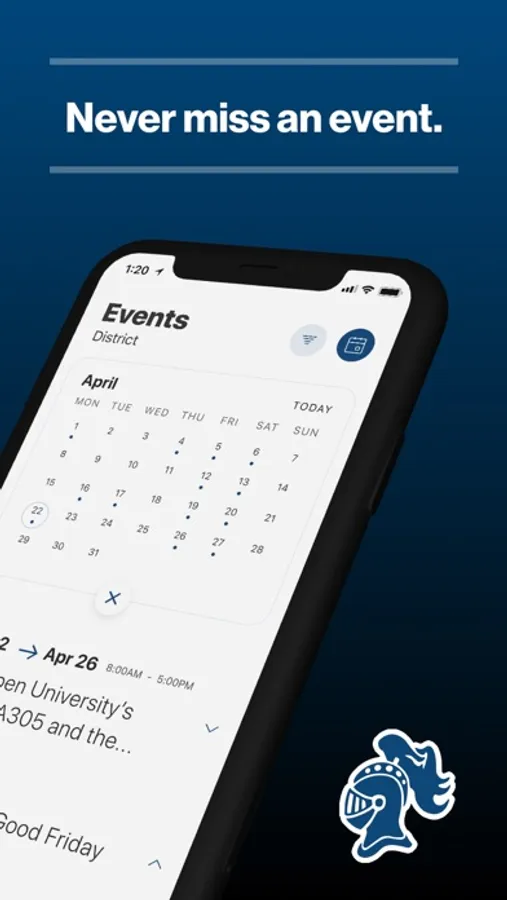 The event section shows a list of events throughout the district. Users can add an event to their calendar to share the event with friends and family with one tap.
