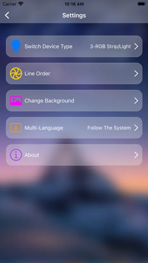 This App can be used to change color and brightness of lights, set various dynamic lighting effects and scene modes, and even make some style rhythm of music through the MIC in the LED controler. In addition, you can also make a schedule to turn on/off your lights, adjust the RGB line order, and some DIY settings, such as custom background and display language etc,.