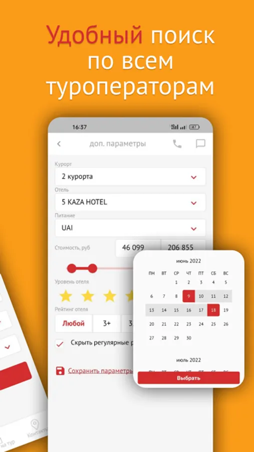 Поиск туров осуществляется по всем туроператорам, в том числе: Anex, TUI, Coral, Tez Tour, Pegas, Sunmar, Библио Глобус и других крупных компаний. В приложении разработан интуитивно понятный интерфейс с подробными параметрами поиска, что позволяет найти идеальную путёвку легко и быстро.