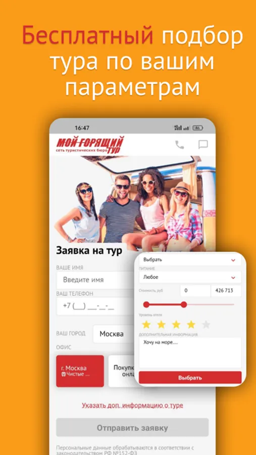 Приложение - это наш новый бесплатный продукт. Цель которого, сделать поиск выгодного и идеального тура удобным. В стартовой версии есть поисковик и витрина туров. А также возможность купить выбранную путевку онлайн или отправить заявку на подбор тура, где бесплатно по заданным параметрам отправим несколько вариантов отдыха. После анализа первой версии продукта начнём выгружать обновления с остальным функционалом, который необходим для современного туриста.