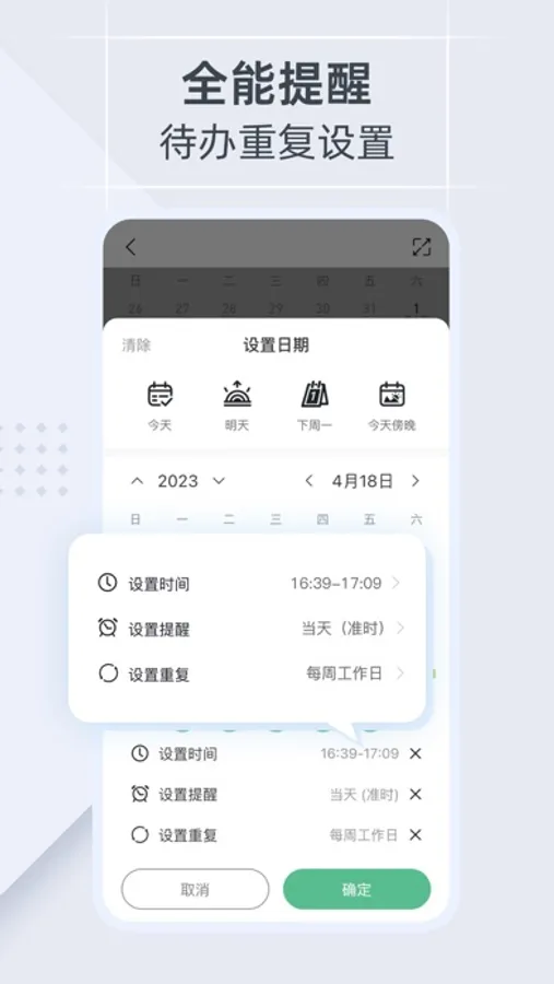 - 随心重复:支持按【日、周、月】【农历】设置重复待办,让你便捷管理中长期重要事项。