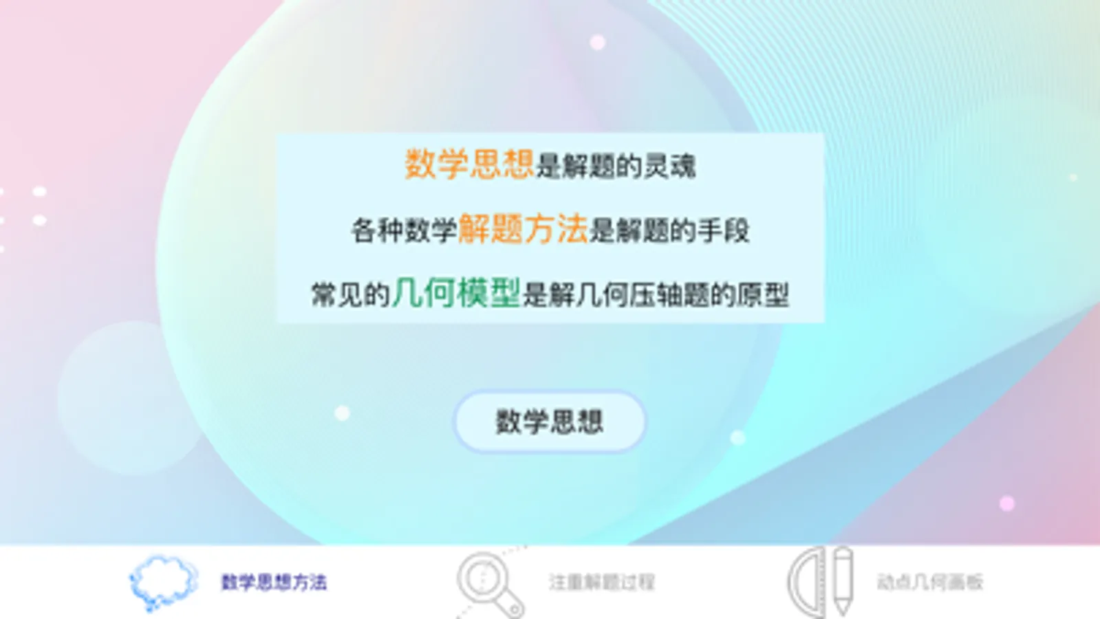 本应用介绍了中考数学压轴题中涉及的数学思想方法包括:函数思想, 方程思想, 数形结合思想, 分类讨论思想, 化归和转化思想;以及中考数学压轴题常用解题方法和精选的几何模型。