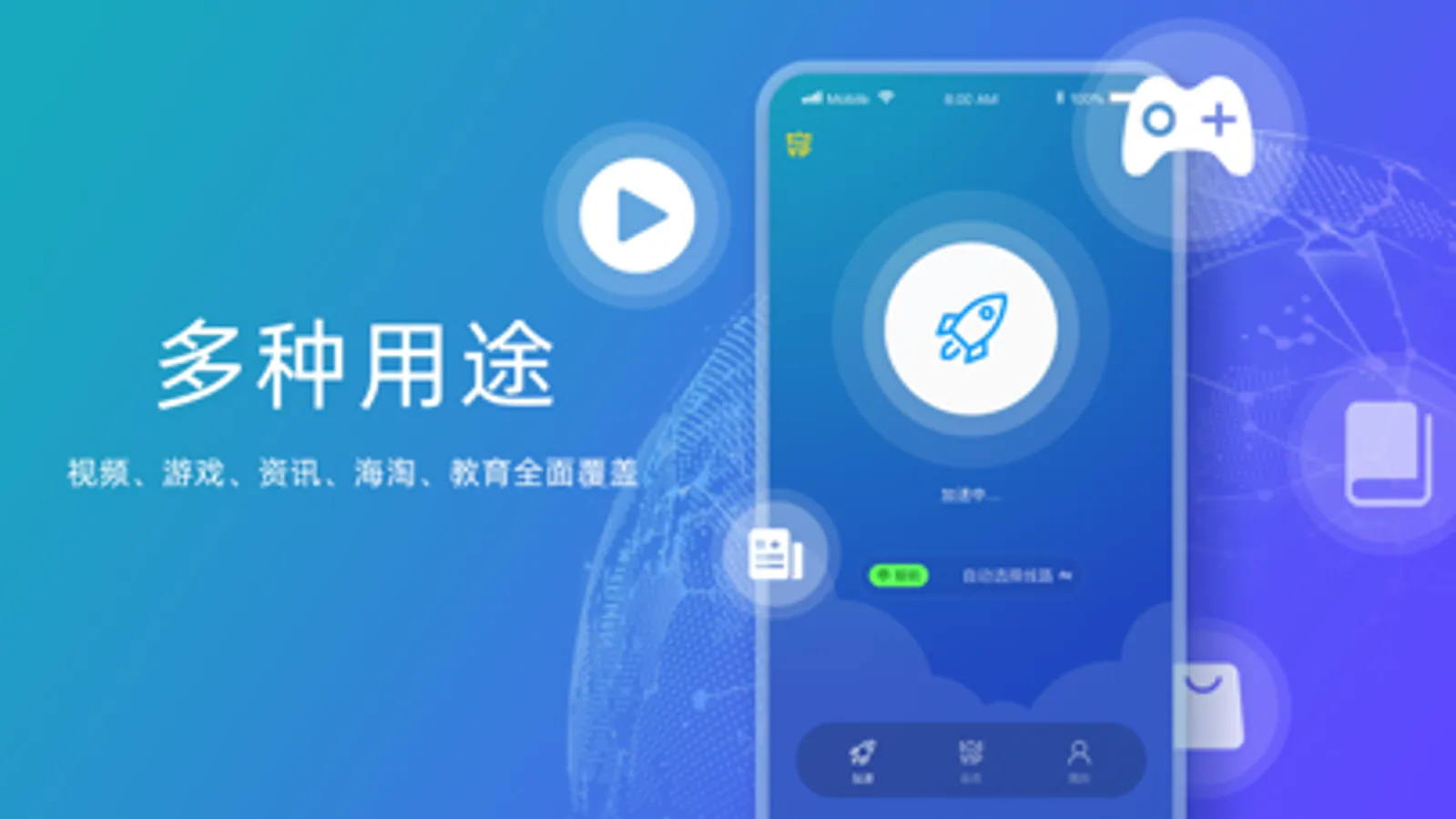 适用于玩手游时网络加速,无需选择游戏、节点,一键起飞,全线加速,降低丢包、延迟,解决游戏掉线、联机困难等问题;