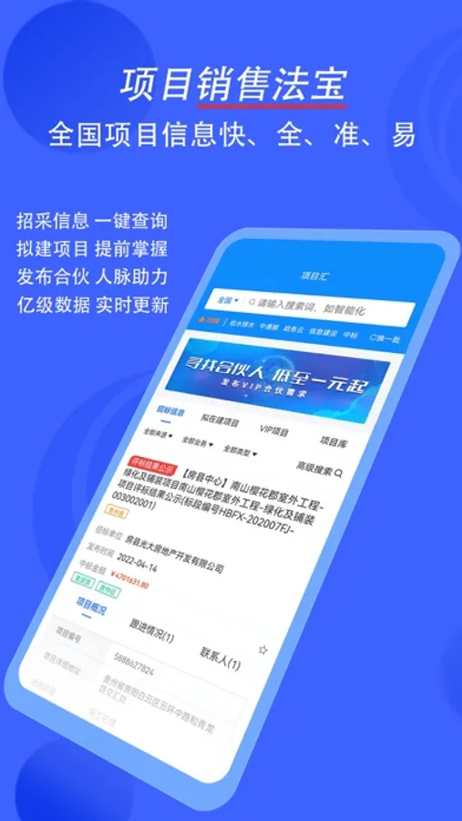 1、覆盖全国招采项目,国企、央企等大型企事业单位招采信息,拟在建项目,VIP项目,投资项目库,民间资本项目,PPP项目,招商引资项目等,还可低至1元发布VIP项目合伙需求,寻找项目合伙人。