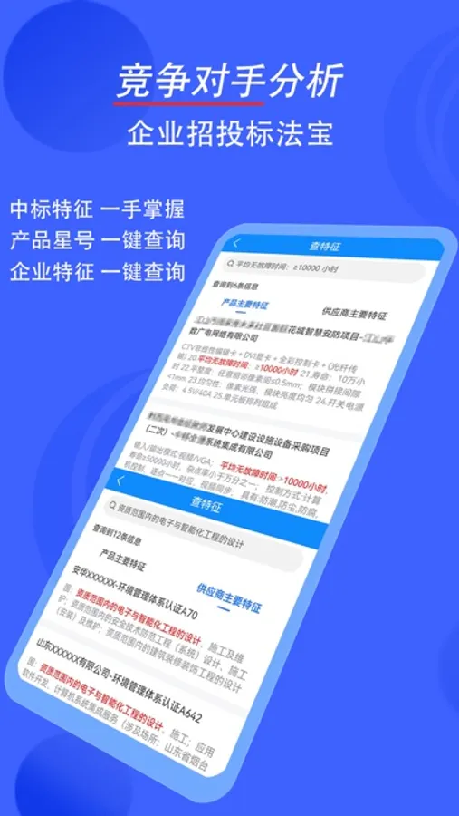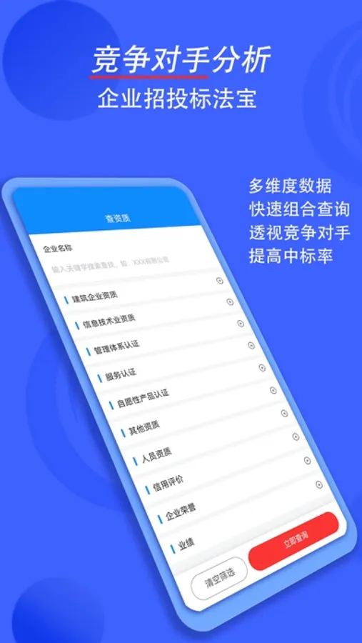 1、涵盖住建部、水利部、交通部等招标要求涉及的资质 人员 业绩 荣誉 奖项 信用 管理体系等多维度数据快速组合查询,筛选潜在投标对手,知己知彼,百战不殆。