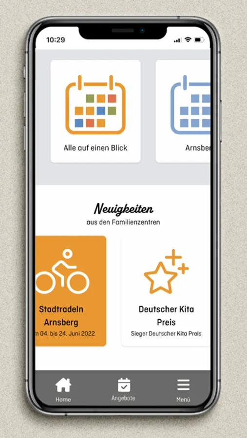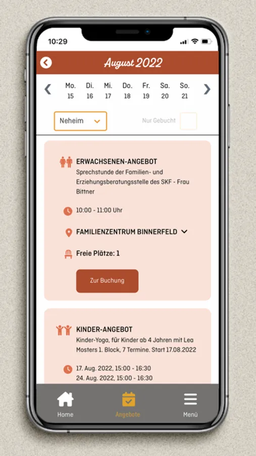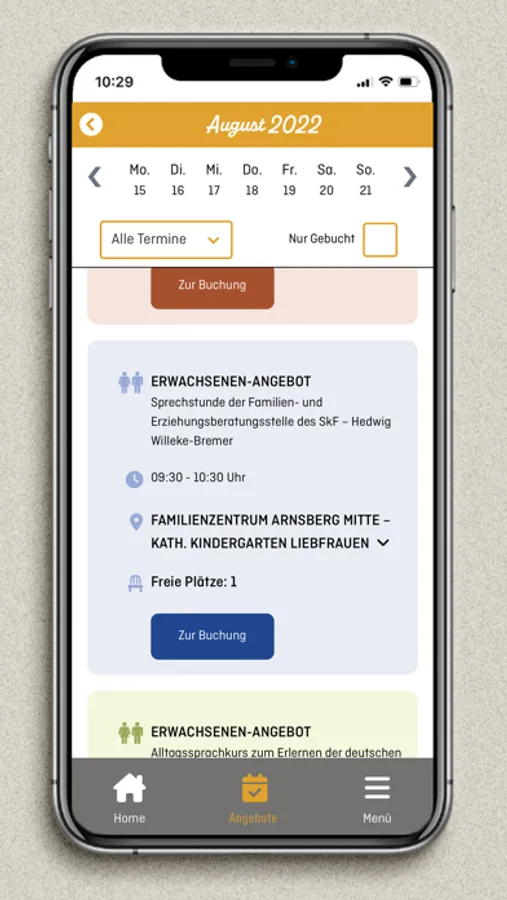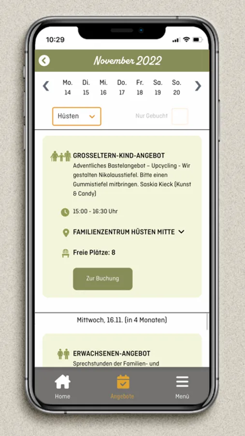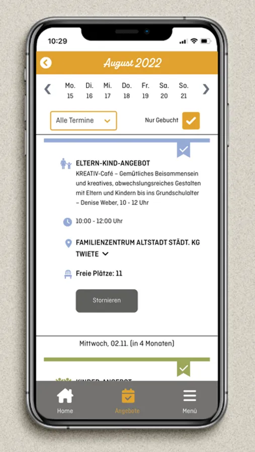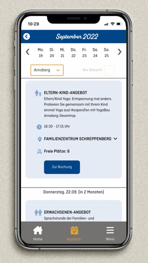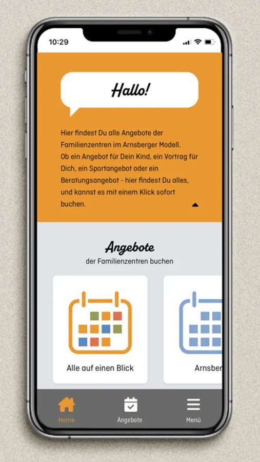 Mit unserer App hast du alles an einem Ort. Eltern-Kind-, Erwach- senen-, Kinder-, Großeltern-Kind- oder Vater-Kinder-Angebote in deiner Umgebung. Du kannst Kurse buchen und Neuigkeiten anzeigen lassen.
