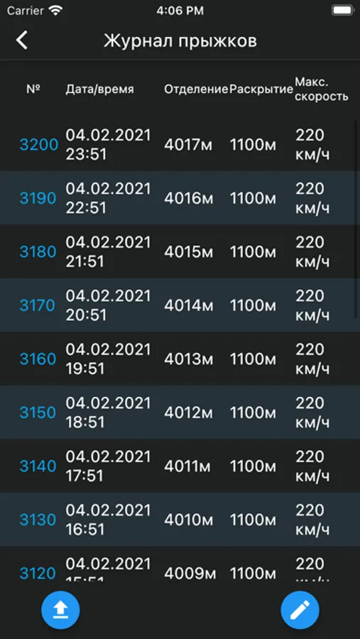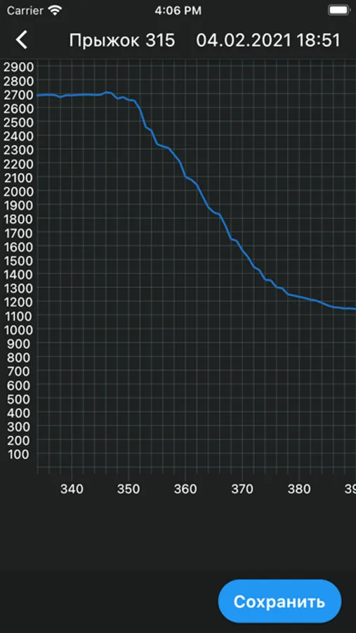 просматривать данные о совершённых прыжках, в том числе, графики высоты для 12 крайних.