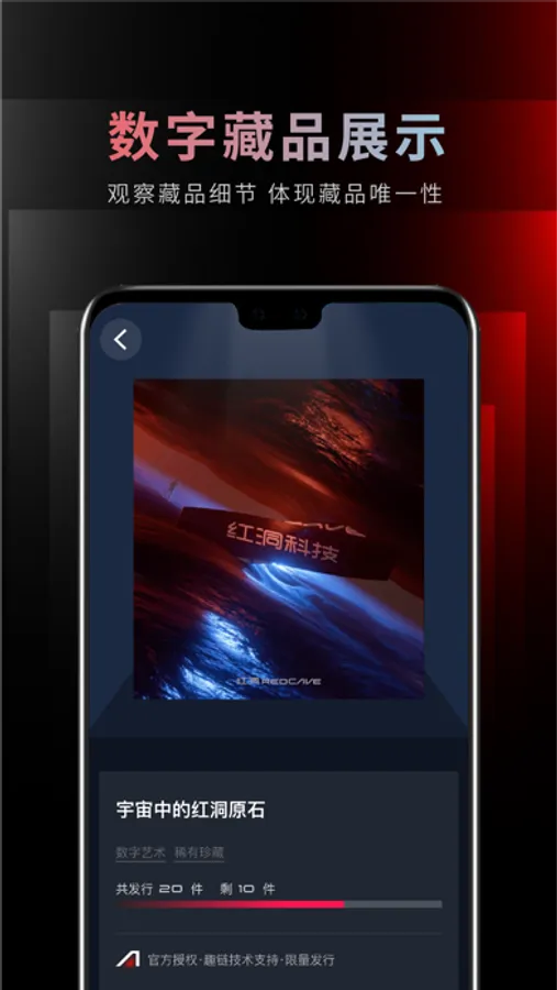 红洞数字藏品平台(以下简称红洞数藏)是由北京红洞科技有限公司自主设计研发的合规数字藏品交易平台,旨在成为用户与数字世界的连接器。