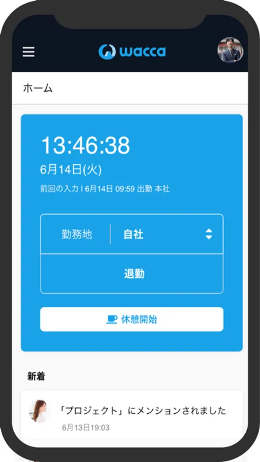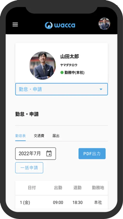 L 日々の出退勤の管理や交通費などをスマートフォンから手軽に操作可能です。