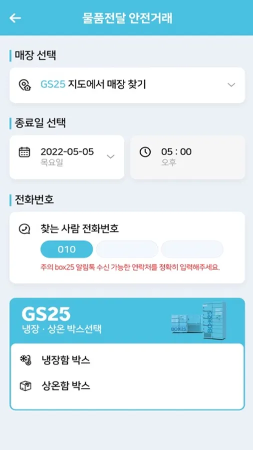 - 본인인증 후 1일 단위로 BOX25 냉장/상온함을 물품전달함으로 이용하실 수 있습니다.