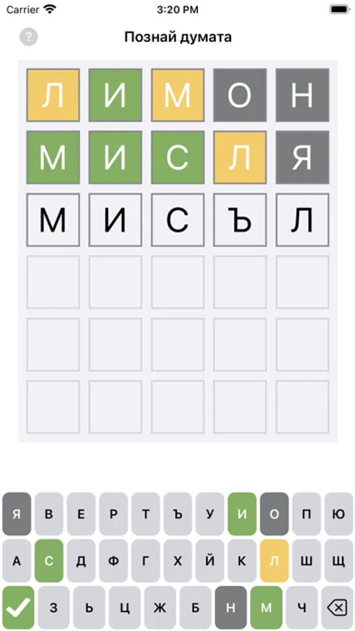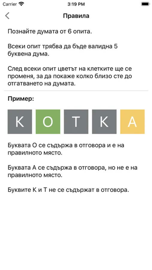 - Жълто - буквата се съдържа в отговора, но не е на правилното място.