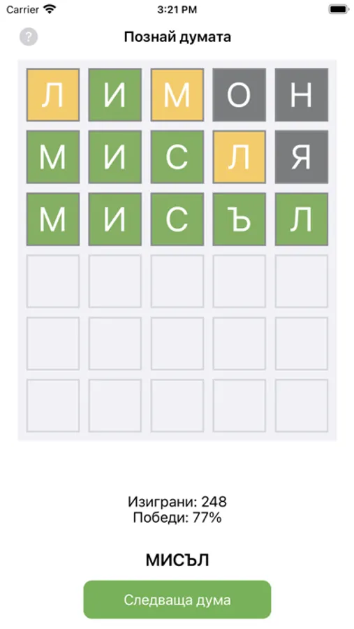 - Зелено - буквата се съдържа в отговора и е на правилното място.