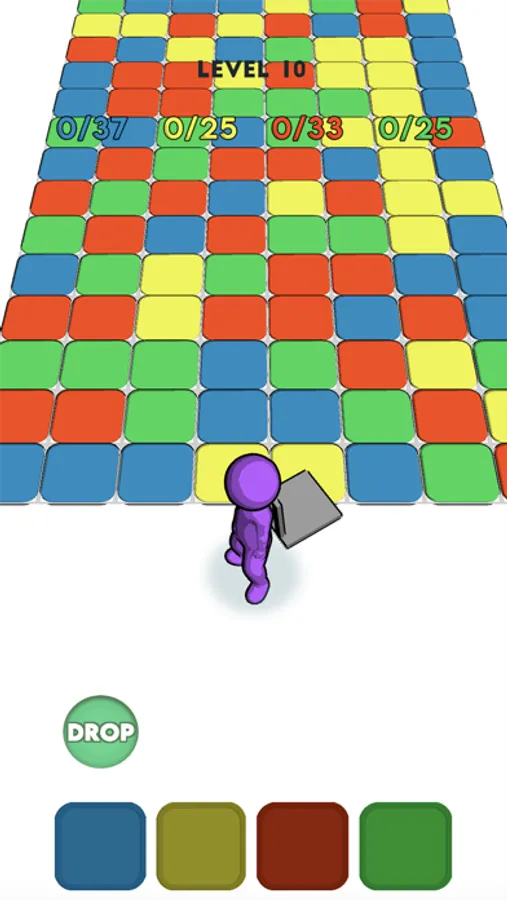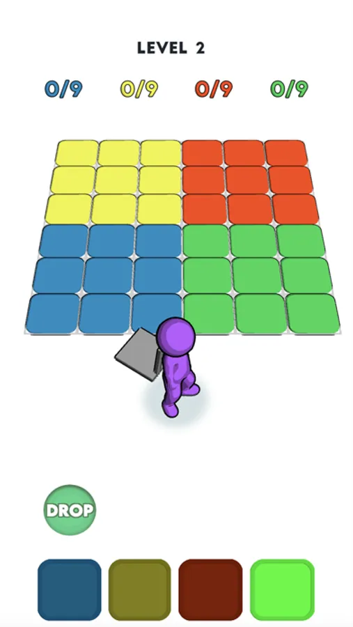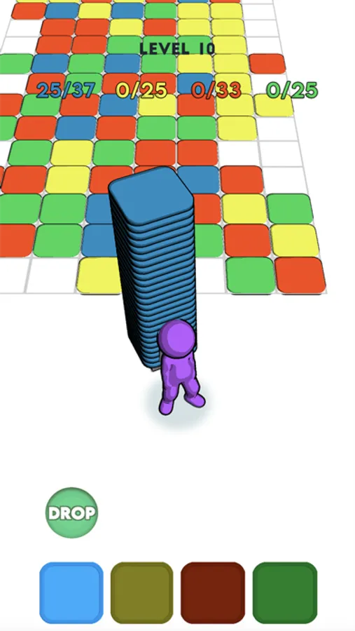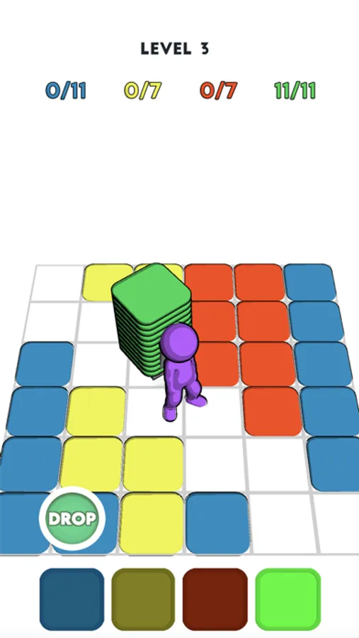 Uncover the entire grid! Guide your avatar: for each color, stack the tiles you can have access to in your back, drop your pile when needed, until you have one and only pile to drop.