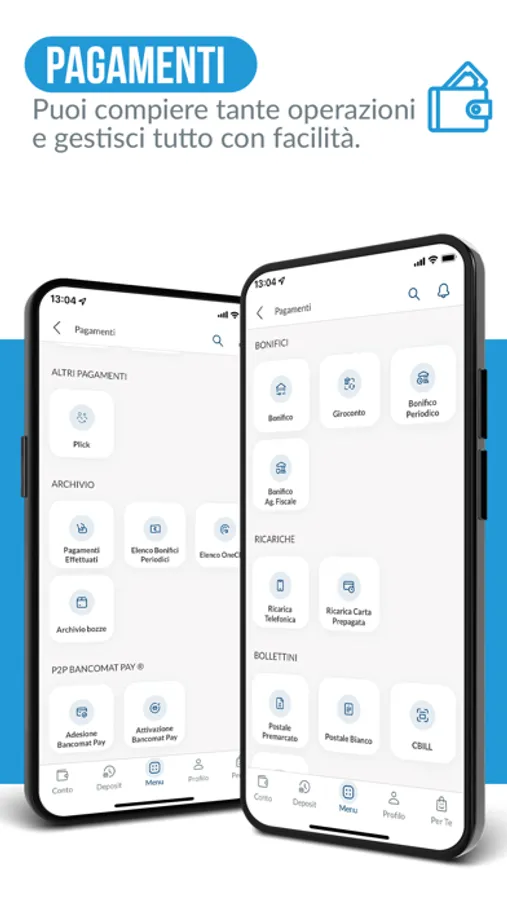 • in pochi passaggi puoi effettuare bonifici e F24 semplificati, pagare bollettini tramite circuito CBILL, acquistare ricariche telefoniche e tanto altro!