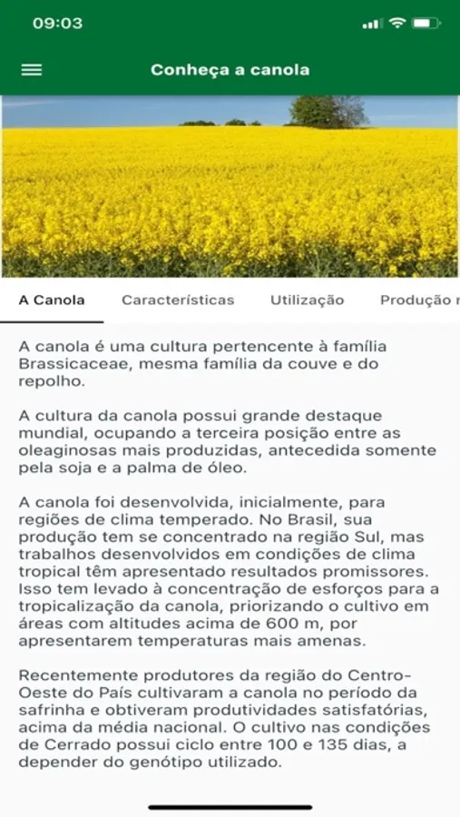 O Mais Canola é um aplicativo desenvolvido pela Embrapa Agroenergia que permite gerenciar todo o ciclo de produção da Canola. Nele, você pode registrar a sua lavoura, acompanhar todas as fases do plantio, gerando relatórios e gráficos, e utilizar a calculadora de sementes para ter plantios mais uniformes. A ferramenta disponibiliza informações sobre cultivares disponíveis no mercado, herbicidas, inseticidas e produtos fitossanitários indicados para a cultura, além de notícias, vídeos, publicações e calendário de cursos e eventos. No aplicativo também é possível esclarecer todas as suas dúvidas, falando diretamente com nossos pesquisadores, por meio do Serviço de Atendimento ao Cidadão (SAC).