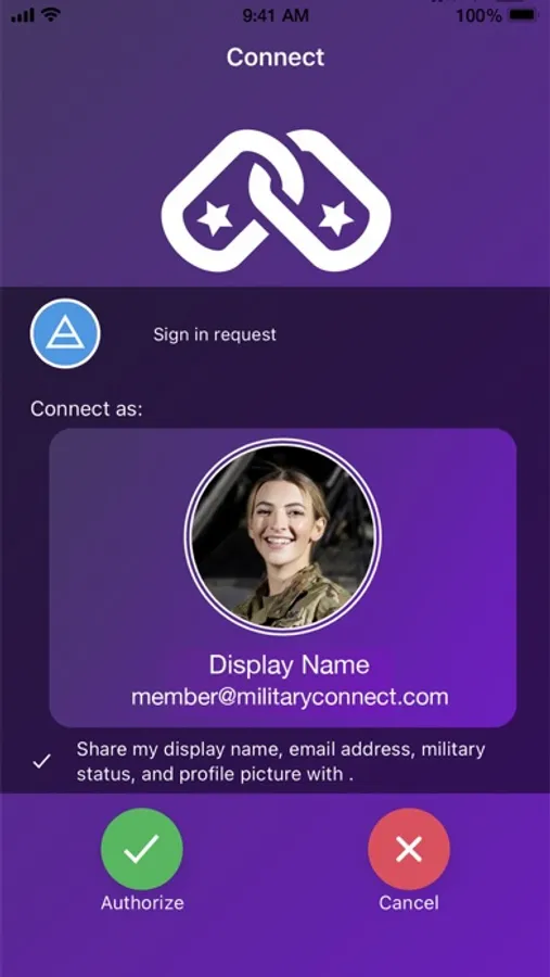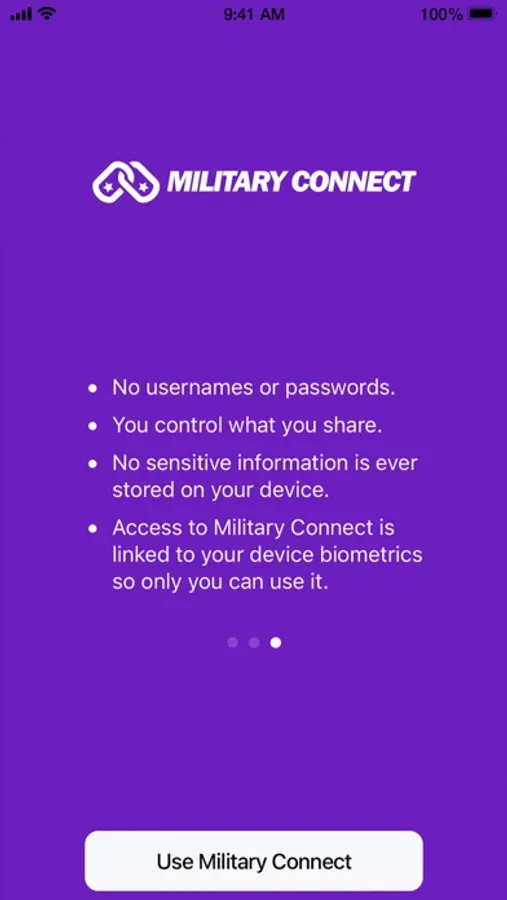Military Connect is powered by the world's most secure personal identity authentication system. Military Connect protects your privacy, prevents fraud and identity theft, and eliminates all of the hassles around proving your identity. Multi-Party Authentication technology eliminates passwords and guarantees your security and privacy. Your personal identity information is never shared with anyone without your direct consent, putting you in control of your own data.