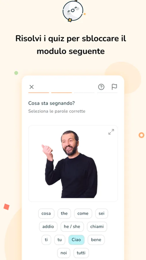 Ogni modulo comprende dalle 4 alle 7 lezioni, con la quale si possono apprendere nuovi segni, ripassare quelli già conosciuti, e comprendere la grammatica della Lingua dei Segni Italiana.