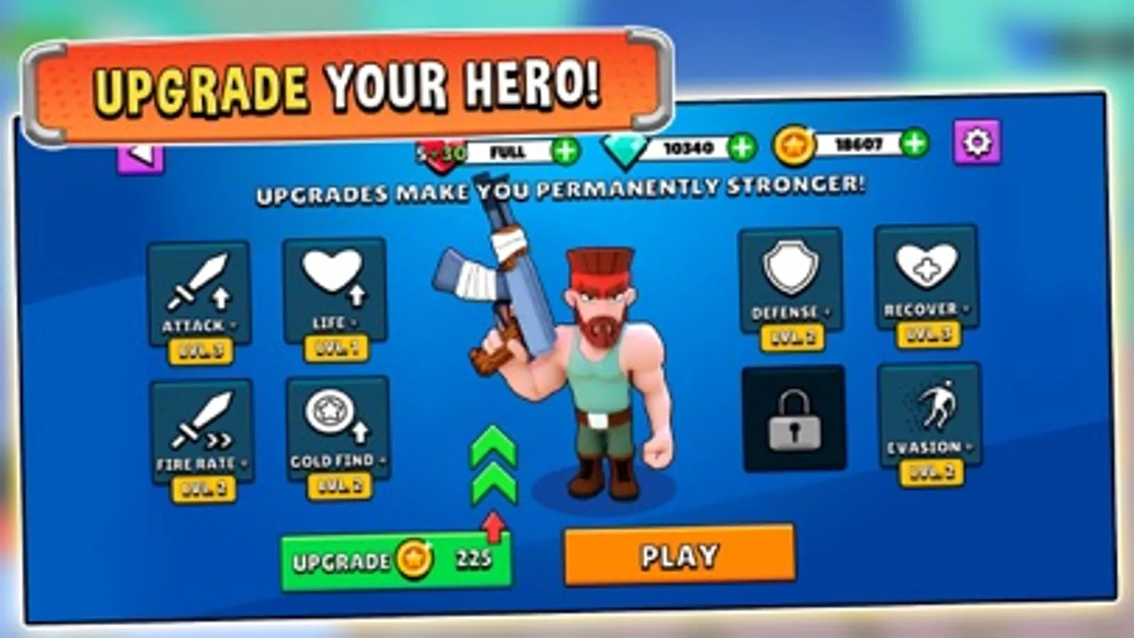 Still dying, agent? Never mind that: unlock and equip permanent retro game arcade gun shooter game and platformer hero upgrades and start a new war run bigger and badder than ever, jumping right into the action again for another run and gun match!