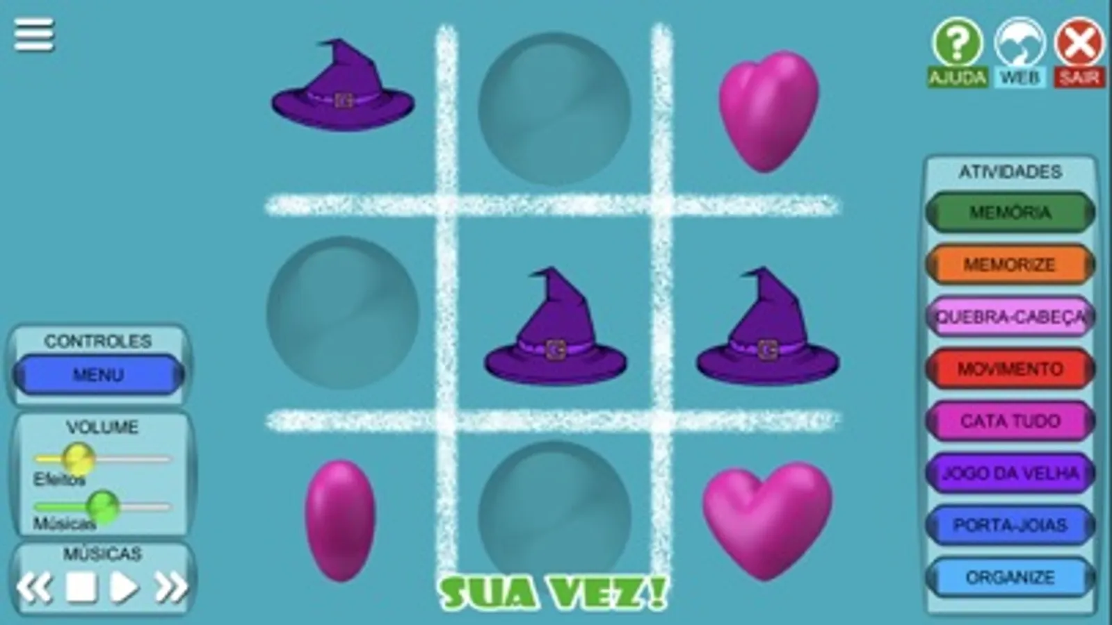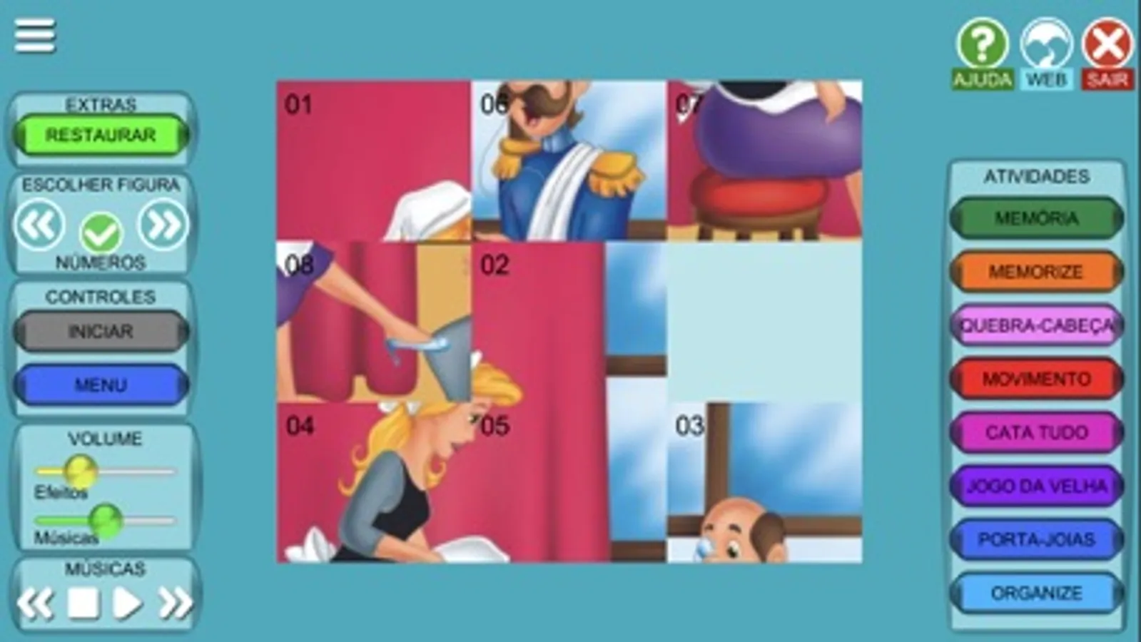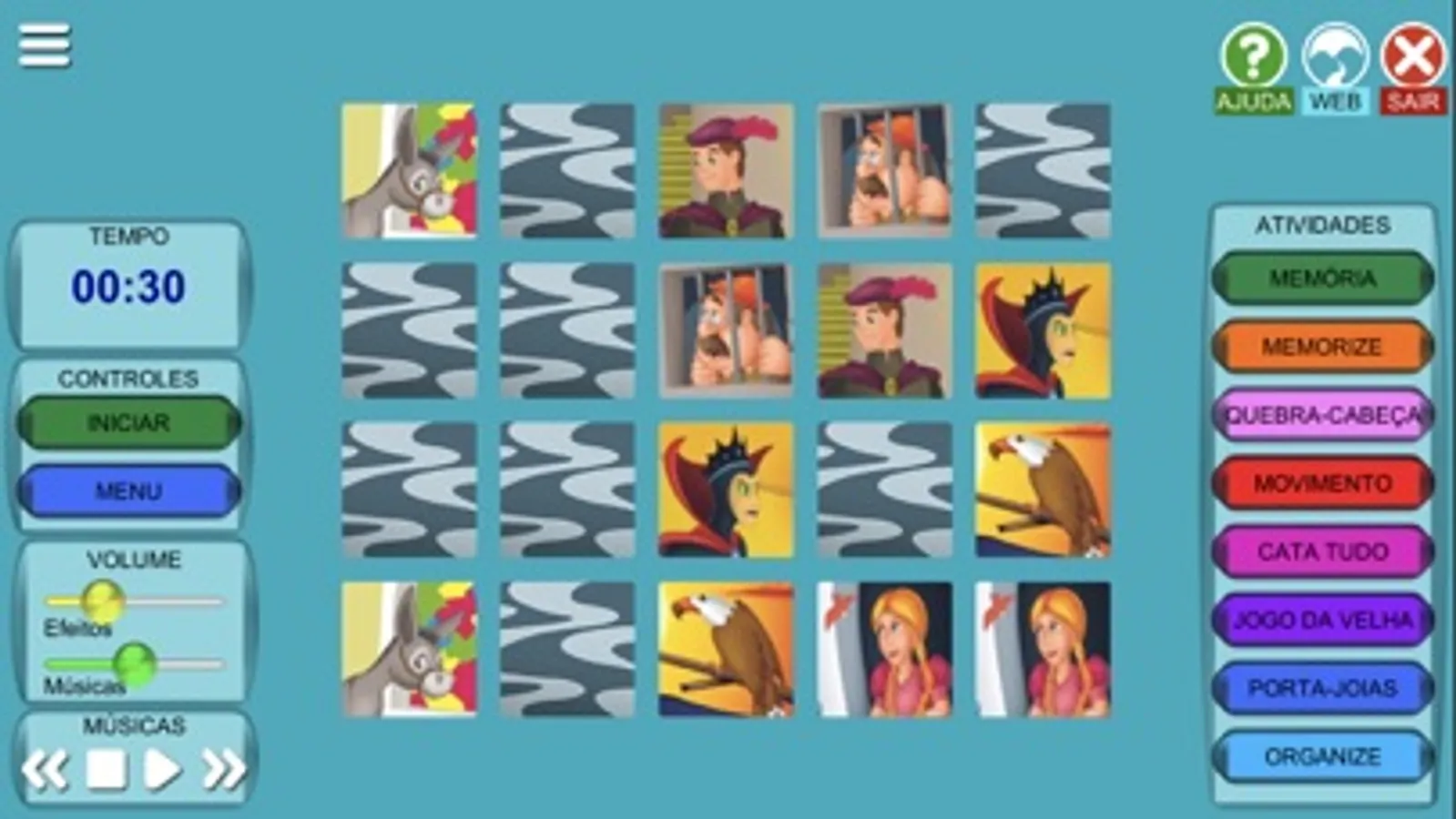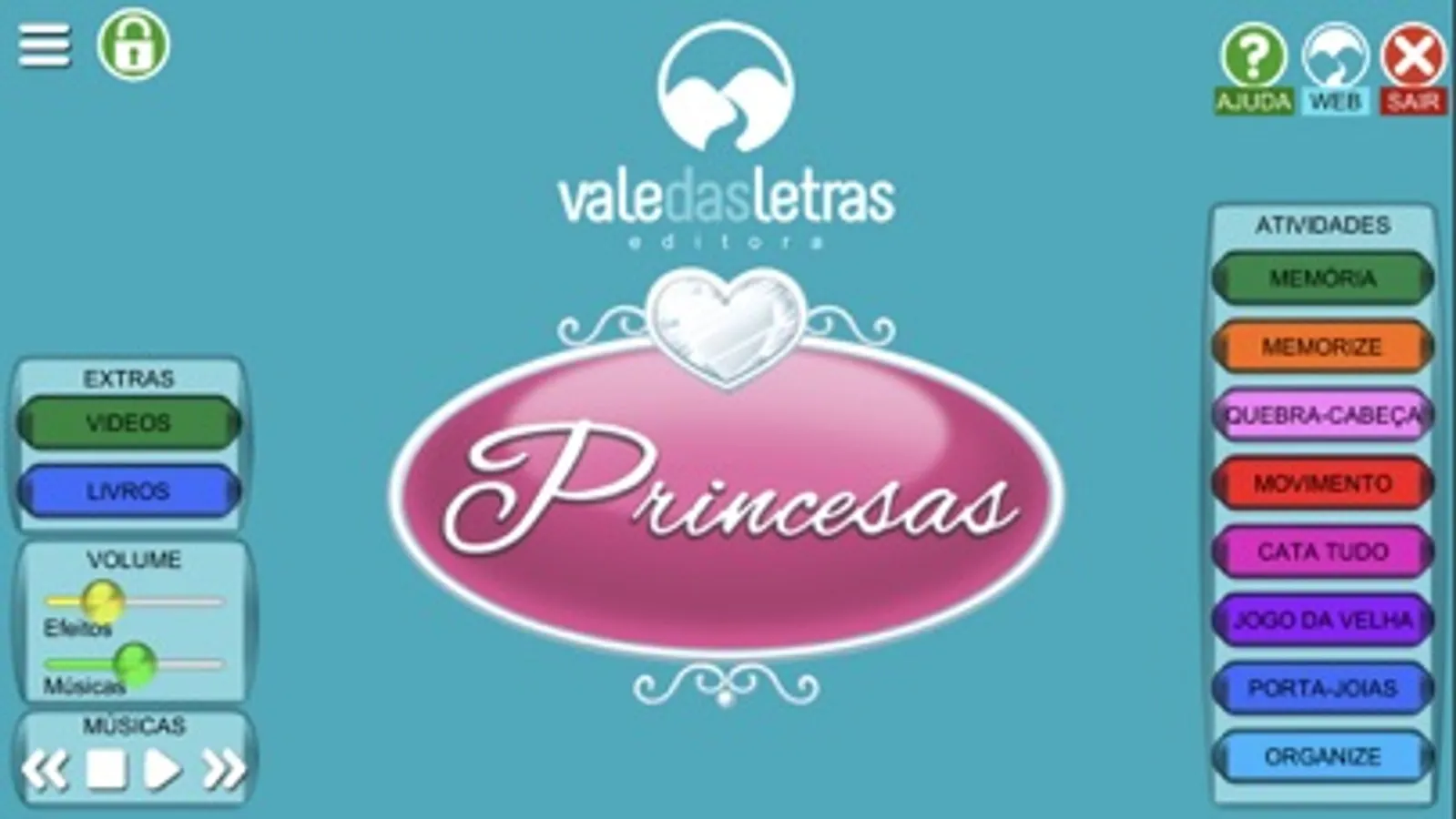 Aplicativo desenvolvido como complemento aos livros da coleção "Princesas", da Editora Vale das Letras. Contém diversas atividades concebidas para o desenvolvimento da capacidade de raciocínio lógico e motora, como: Quebra-Cabeça, Memória, Cata Tudo, Jogo da Velha, Memorize, Organize.