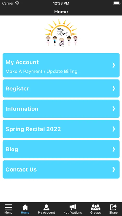 The Miss Kim's app allows you to manage your account with ease, register for classes, parties, and special events. You'll also receive important notifications about class changes, closings, registration openings, special announcements, and upcoming events.