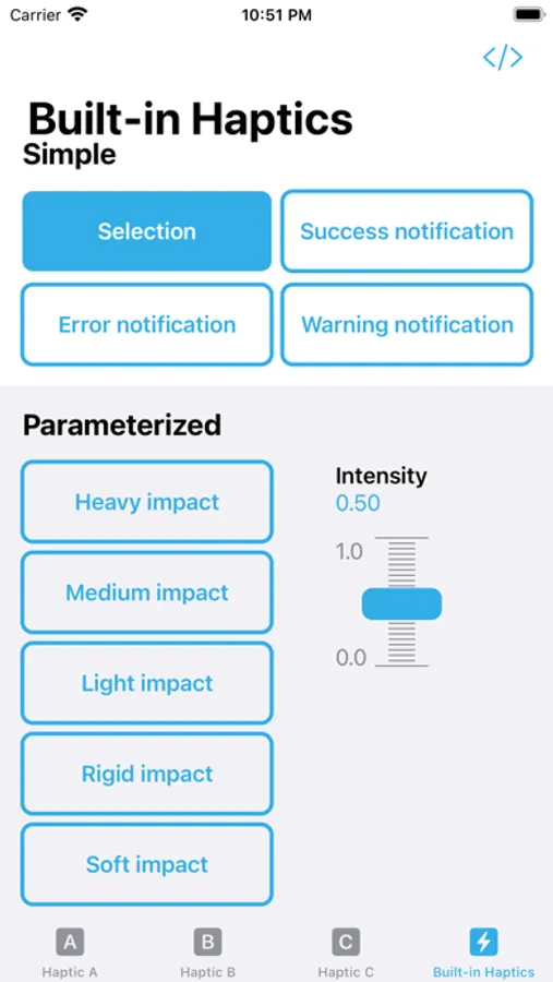Building an app that offers haptic feedback? Haptics Studio helps you discover the perfect customized haptics for your app. Haptic Studio offers you three save slots, each with their own unique color. Tap the "Play" buttons at the bottom of the screen to play the corresponding haptic, and switch to it if not already on that screen.