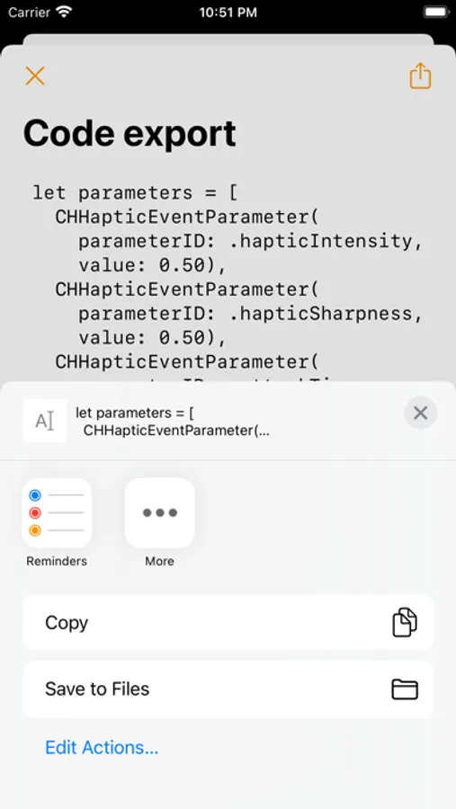 Tap the "Code" symbol at the top of the screen to share the code to generate that haptic effect!