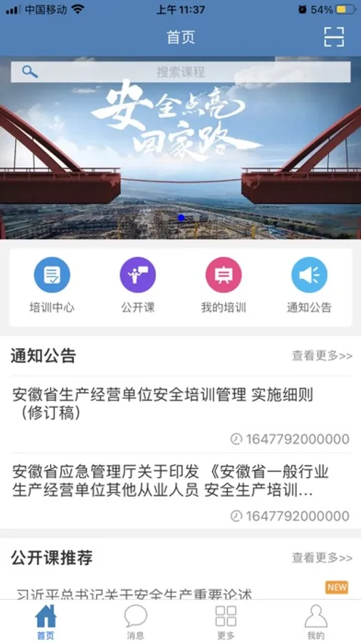 1、首页:首页培训中心、公开课、我的培训、通知公告模块组成