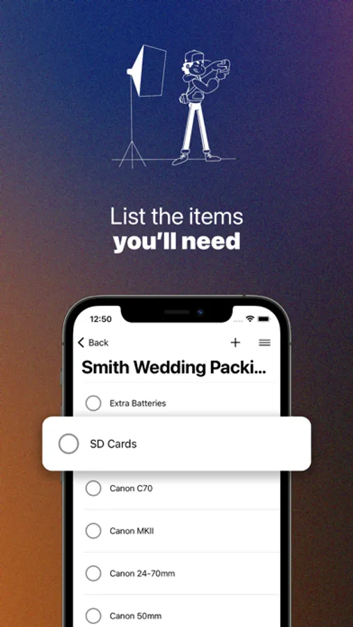 Construct individual lists of specific shots that you need to make happen. Create multiple lists for whatever organization method makes the most sense to you.