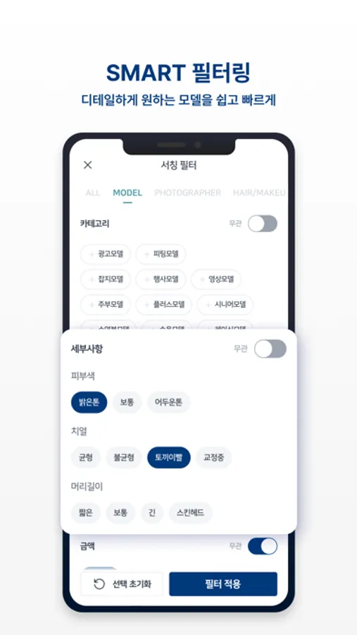 성별 뿐 아니라, 헤어 컬러, 헤어 기장, 목소리 톤, 타투 위치까지 세세한 필터로 원하는 모델 이미지를 쉽게 찾을 수 있습니다.