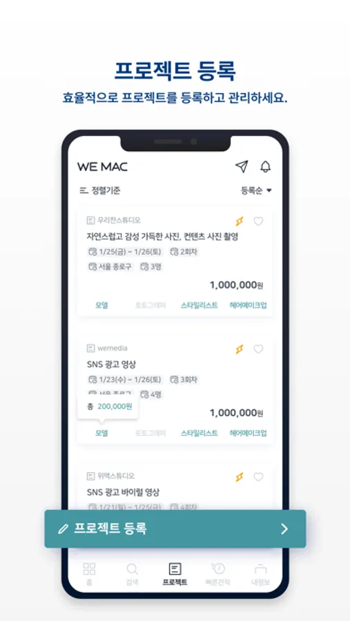 프로젝트를 직접 등록하여 작업자를 모집해보세요. 모집 일정이 얼마 남지 않은 프로젝트는 번개 모양이 별도 표시가 됩니다.