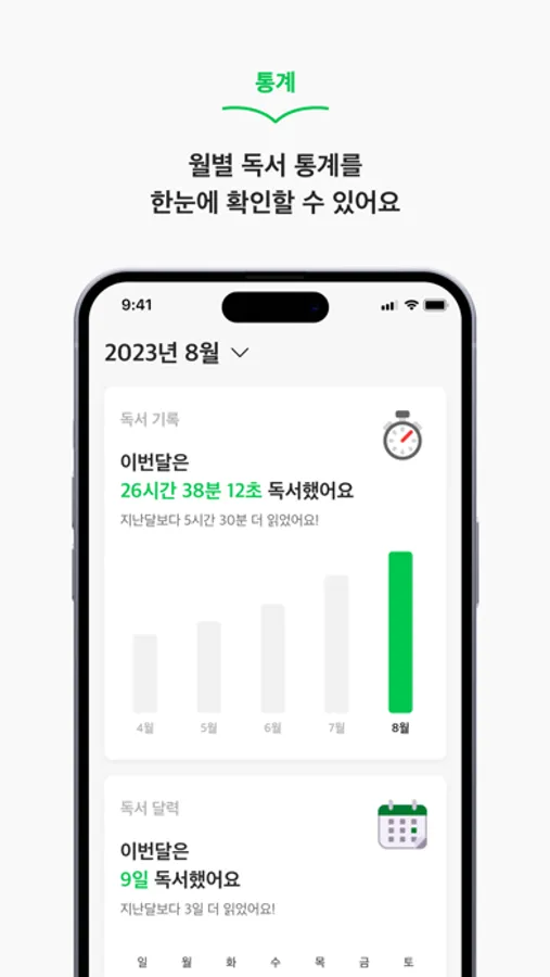 월별 독서 통계를 한눈에 확인할 수 있어요.