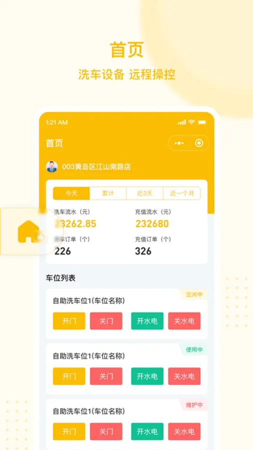 用于商户对店铺的营收统计、洗车位远程操控、订单管理、会员管理、洗车计费规则设置、充值套餐设置、店铺基本设置等。