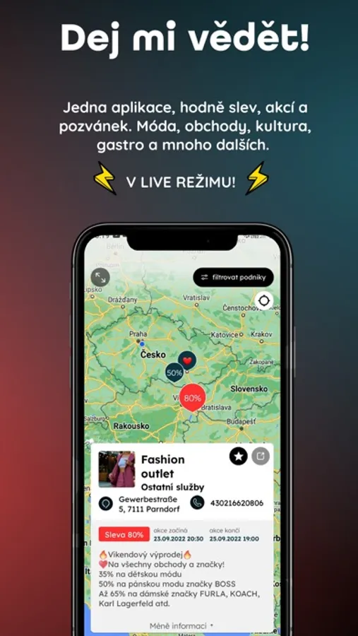 "Dej mi vědět! PRO" is a top-notch application for businesses and announcers who are looking for a fast and efficient way to inform their customers about their latest deals, discounts, and events. Dej mi vědět! PRO is a fast, reliable, and easy-to-use application that can help businesses strengthen their relationships with customers and improve their business. Register your business and be on the map!