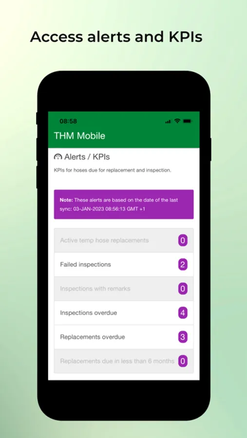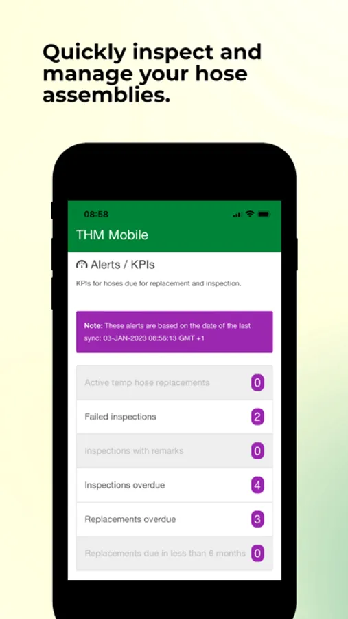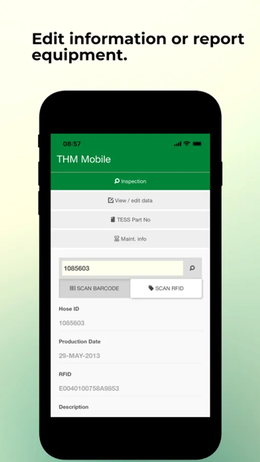 Scan barcode and/or RFID tag to access and manage equipment / flexible hose assemblies. Report visual inspections, replacements and pressure testing on site. Edit equipment information and report equipment as scrapped. Can be used offline (wifi needed only when downloading/uploading data).