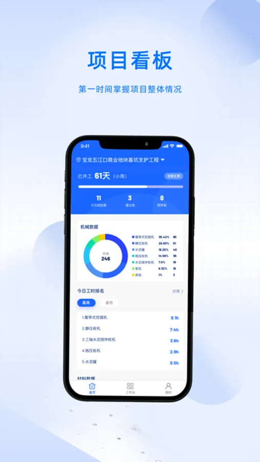 蝾螈智慧工地App,提供机械管理、设备管理、材料管理、成桩管理等功能。