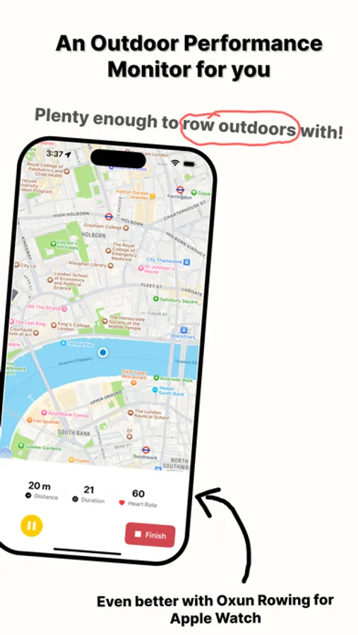 You already carry your phone when rowing outdoors for safety reasons - So simply hit record in Oxun and it will track your GPS locations over time for your erg session.