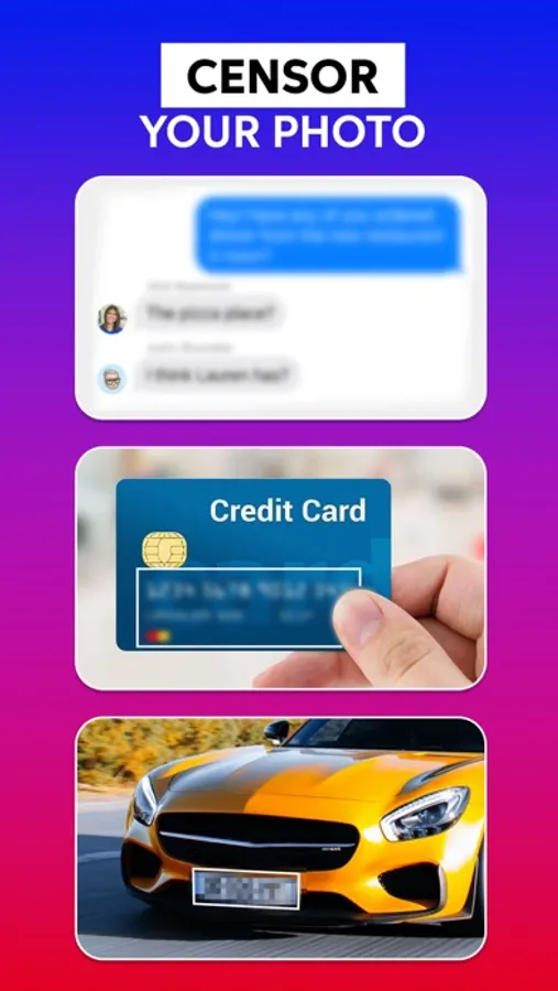 This auto blur background app which enables you to blur out any object from your picture. You can also use it to blur face, words or text on a document, credit card info, car number plate, censor photos or anything else.