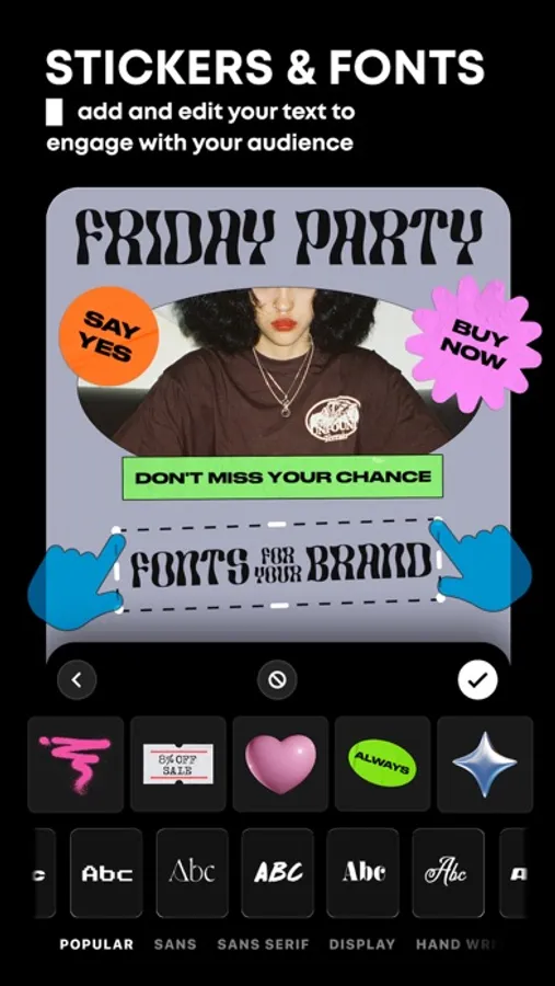 Make your brand message clear and statements loud with any of the hundreds of font varieties: minimalist, bold, expressive or decorative. Customize the text in your captions in imaginative ways to fit your visual identity!