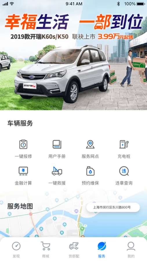 【车辆服务】查看车辆状态,获得一键救援、违章查询、年检、预约维保服务;服务地图充电桩、服务站、经销商网点查询;