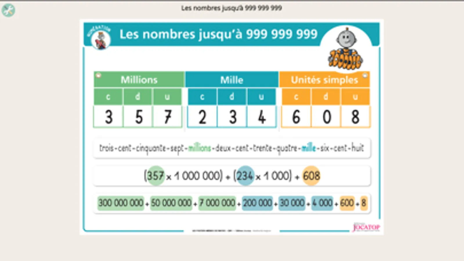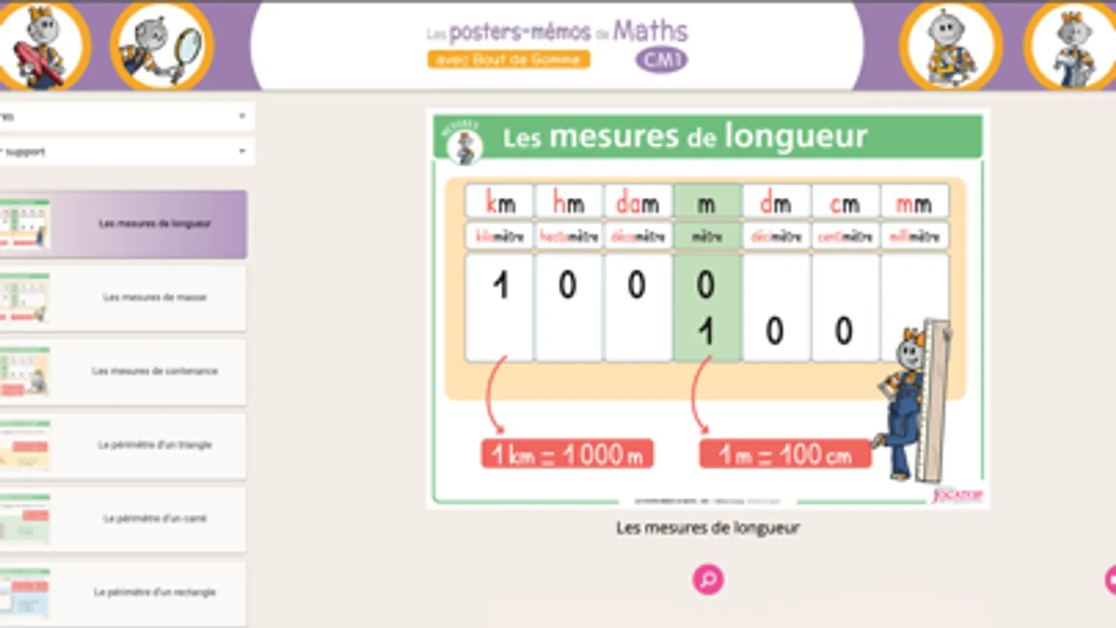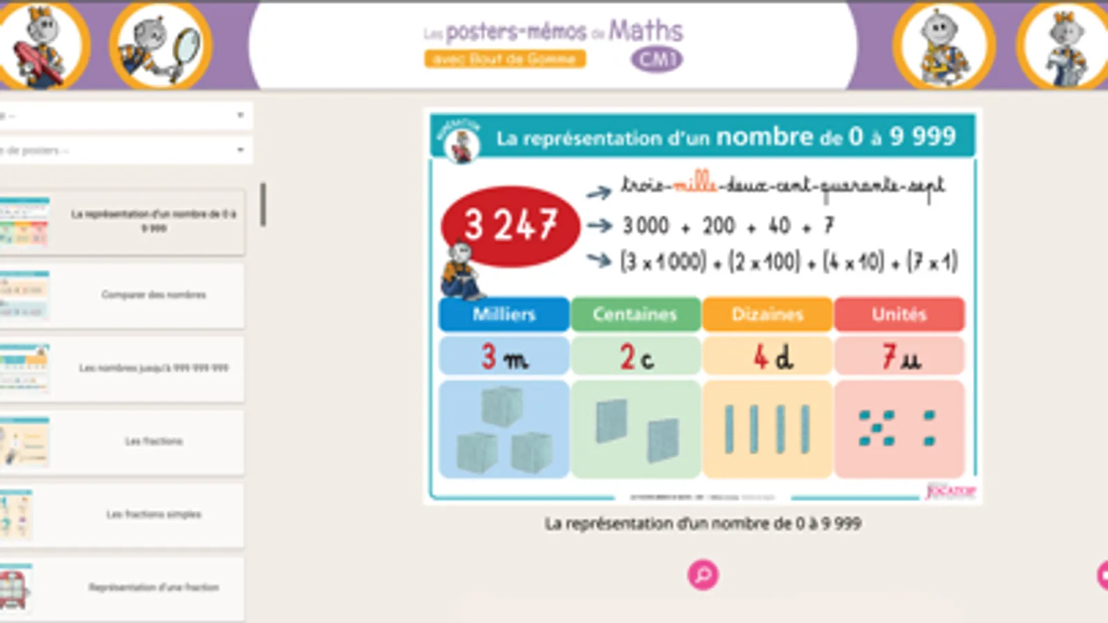 Les indispensables du programme de mathématiques de CM1 sont abordés à travers 40 posters papier, animés par les personnages de Bout de Gomme, Tirobot et Robotine. Trois types de posters sont proposés :