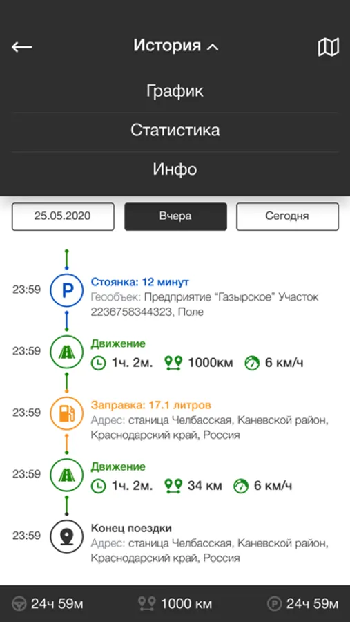 Мобильное приложение для спутникового ГЛОНАСС мониторинга транспорта, служит для оперативного контроля за передвижением техники, скоростным режимом, ежедневными пробегами, стоянками, уровнем топлива, расходом топлива, оборотами двигателя, напряжением бортовой сети, работой навесного оборудования, температурой и множеством других подключенных параметров. Приложение удобно для использования в повседневной работе для точного планирования и управления работой транспорта и спецтехники, контроля проведения технического обслуживания, своевременности выполнения производственных задач, а также предотвращения левых рейсов и воровства топлива.