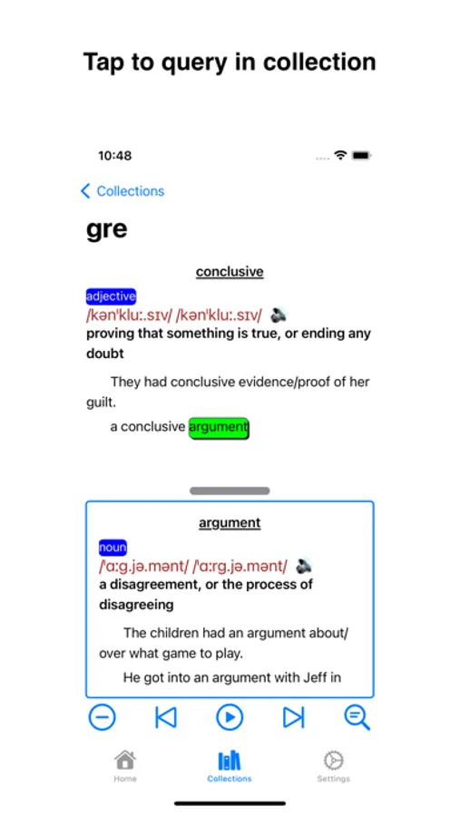 AudioWords is a dictionary tool for you to lookup a new word and read its meanings aloud, or add it into a named collection, so that you could review it afterwards and solidify it by listening to them.