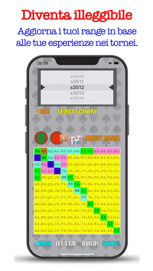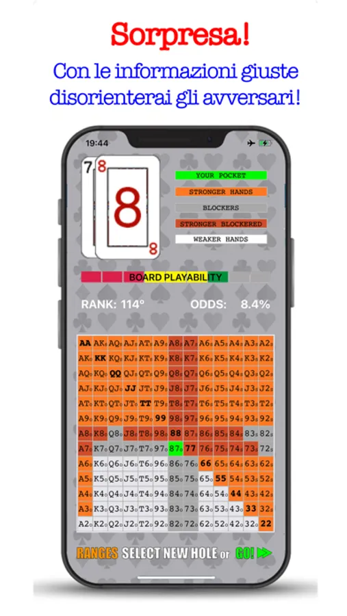 Non è tutto, G.BENDINELLI ha addestrato anche l'intelligenza artificiale, disponibile nella sezione Training dedicata alle aperture preFlop, fornendo oltre 33.000 scenari in cui imparerai SE, COME, e da QUALE POSIZIONE entrare correttamente in una mano secondo il criterio di un campione, per costruirti una strategia esclusiva per abbassare la varianza e presentarti al Flop avendo ottime probabilità di aggiudicarti il Pot.