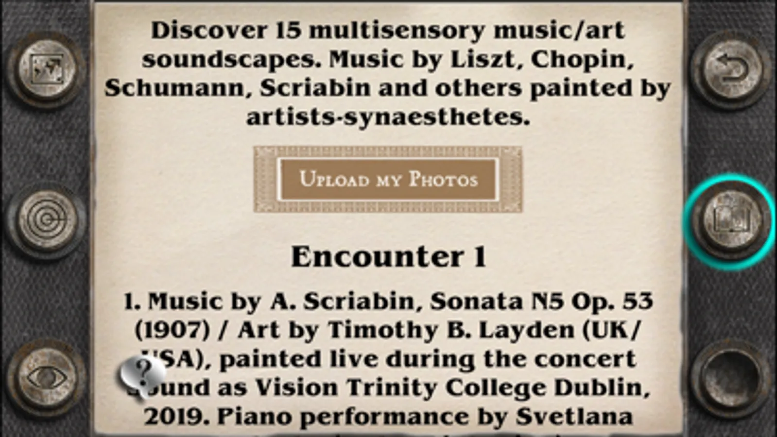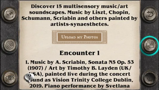 Augmented Reality (AR) art gallery with music by Liszt, Chopin, Schuman, Scriabin and others painted by artists-synaesthetes. The gallery of 15 multisensory soundscape Art episodes is the result of a seven-year collaboration between artists-synaesthetes and concert pianist, composer and researcher Dr Svetlana Rudenko, www.svetlana-rudenko.com