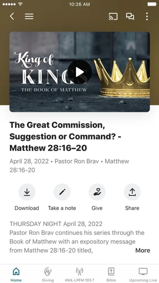 This app will help you stay connected with the day-to-day life of our church. With this app you can: watch or listen to past messages; stay up to date with push notifications; share your favorite messages via Twitter, Facebook, or email; and download messages for offline listening.