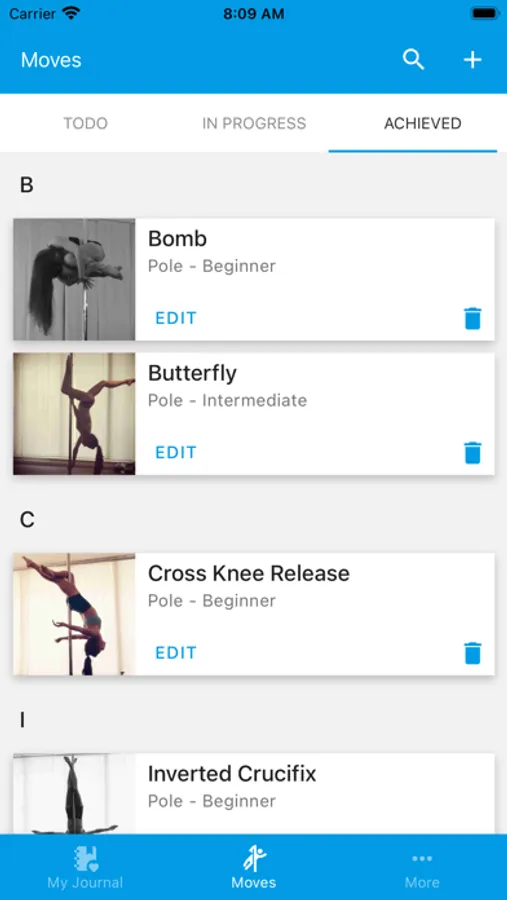 Create your own list of moves. Track the progress by each move with notes, photos and videos. Organize moves by training status (todo/in progress/achieved).